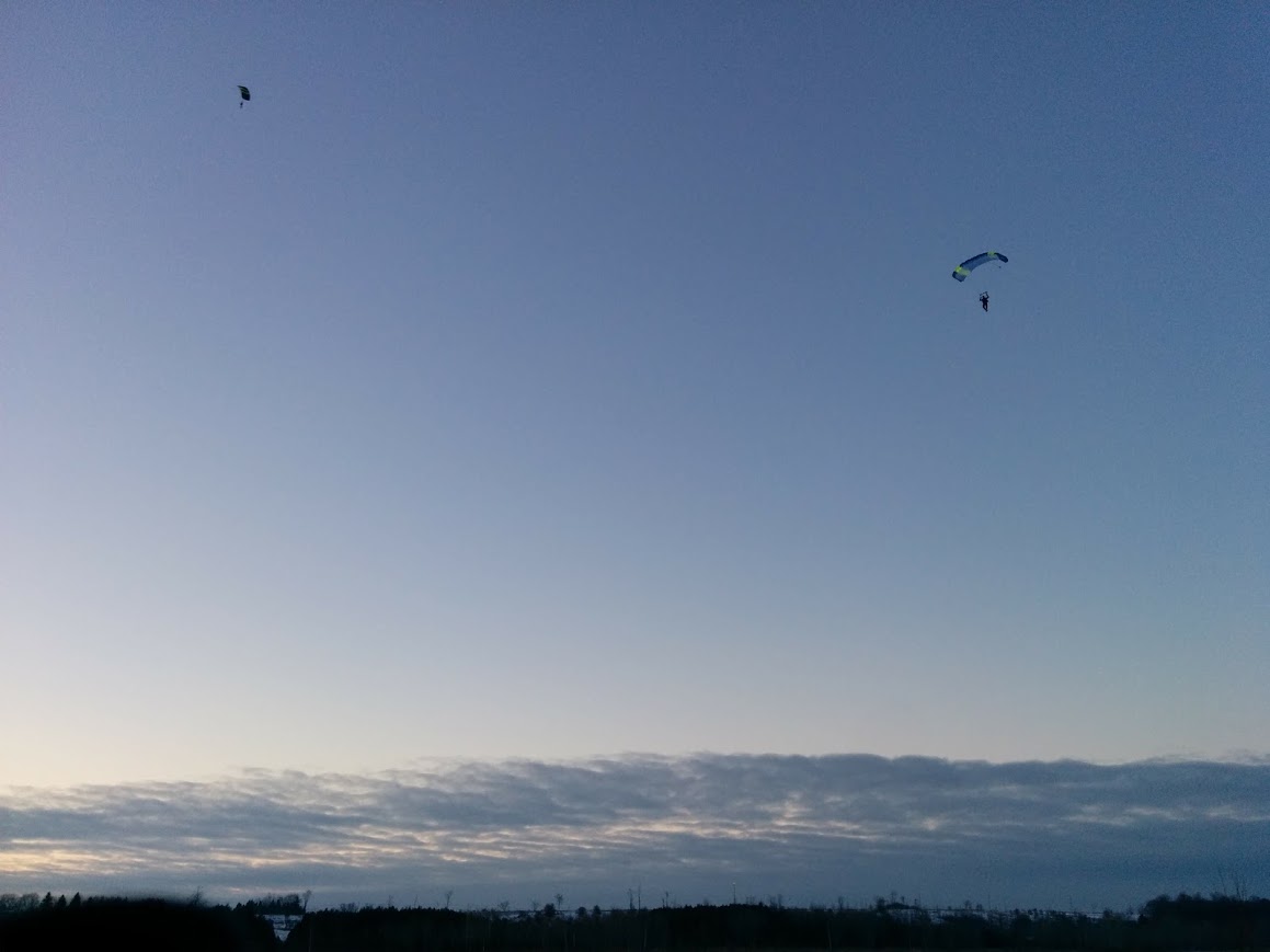 There are not many places to jump through the winter in Canada. If you are a student or a tandem it is pretty limited (and so cold anyway). As a certified jumper there are a few places around. Parachute School of Toronto used to have some jumping in the winter, but they are moving, so I don’t think they will be again.